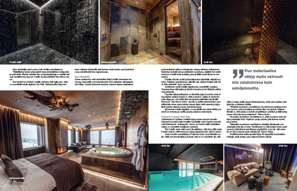 ” Spa-tilan elämyksellisyyteen on kiinnitetty paljon huomiota , sekä eri kansalaisten erilaiset tarpeet on otettu huomioon . Vaikka et menisi kylpylän altaaseen , voit nauttia tilan tunnelmasta pelkästään kansituolilla istuessasi ”, Tatu Ahlroos kertoo . Spa-tila on pyritty maksimoimaan suunnittelemalla unisex sauna kahden saunan sijaan sekä saunasta ja kylpylästä avautuu näkymä suoraan tunturimaisemaan .