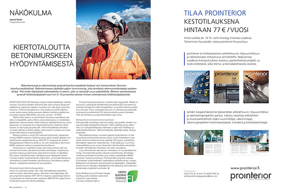 prointerior on korkeatasoinen arkkitehtuuriin , tilasuunnitteluun ja rakentamiseen erikoistunut ammattilehti . Neljä kertaa vuodessa ilmestyvä julkaisu koostuu ajankohtaisista projekti- ja tuote-esittelyistä , sekä teema- ja toimialakohtaisista osioista .
