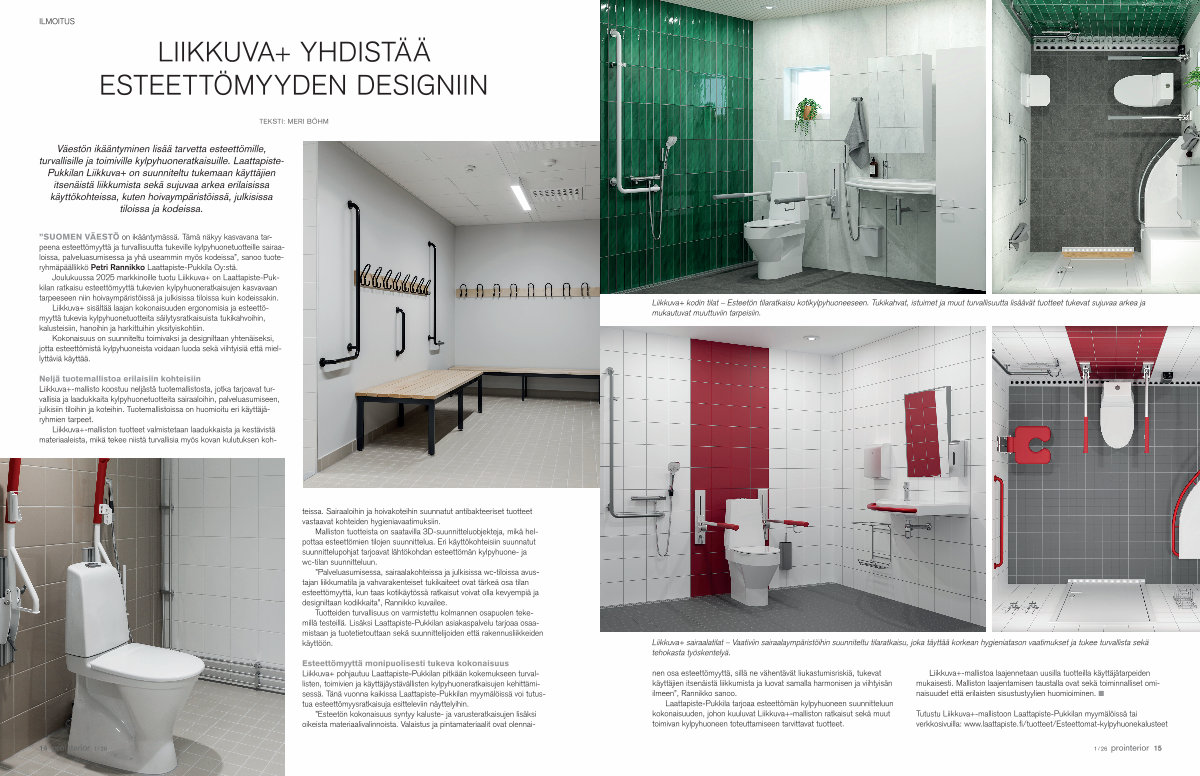 Joulukuussa 2025 markkinoille tuotu Liikkuva + on Laattapiste-Pukkilan ratkaisu esteettömyyttä tukevien kylpyhuoneratkaisujen kasvavaan tarpeeseen niin hoivaympäristöissä ja julkisissa tiloissa kuin kodeissakin.