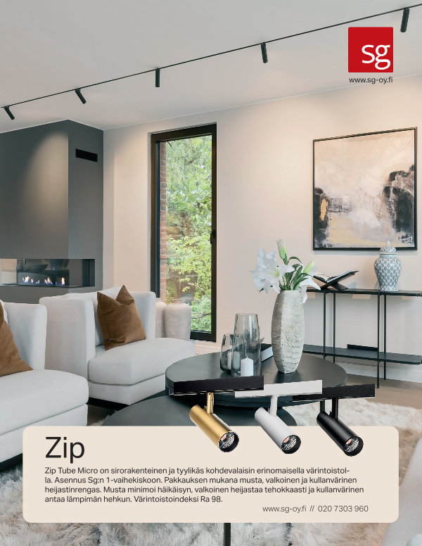 Zip Tube Micro on sirorakenteinen ja tyylikäs kohdevalaisin erinomaisella värintoistolla. Asennus Sg: n 1-vaihekiskoon. Pakkauksen mukana musta, valkoinen ja kullanvärinen heijastinrengas. Musta minimoi häikäisyn, valkoinen heijastaa tehokkaasti ja kullanvärinen antaa lämpimän hehkun. Värintoistoindeksi Ra 98. www. sg-oy. fi // 020 7303 960