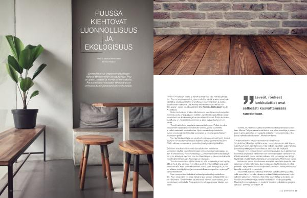 Luonnollisuus ja ympäristöystävällisyys näkyvät tämän hetken sisustuksessa . Puu on ajaton , kestävä ja monipuolinen ratkaisu . Puutuotteiden innovaatiot tähtäävät puun ominaisuuksien parantamiseen entisestään .