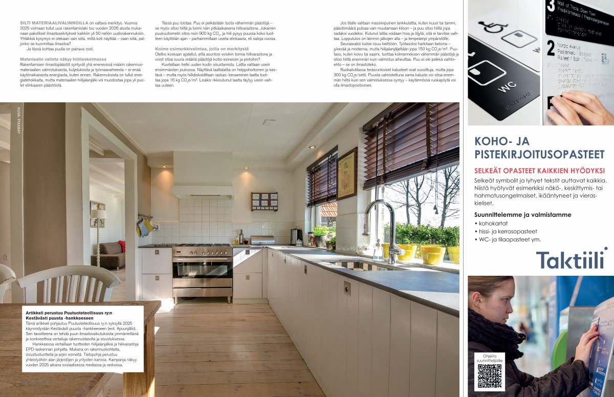 Artikkeli perustuu Puutuoteteollisuus ry: n Kestävästi puusta-hankkeeseen Tämä artikkeli pohjautuu Puutuoteteollisuus ry: n syksyllä 2025 käynnistyvään Kestävästi puusta-hankkeeseen( ent. # puunjälki). Sen tavoitteena on tehdä puun ilmastovaikutuksista ymmärrettäviä ja konkreettisia vertailuja rakennustasolla ja sisustuksessa.