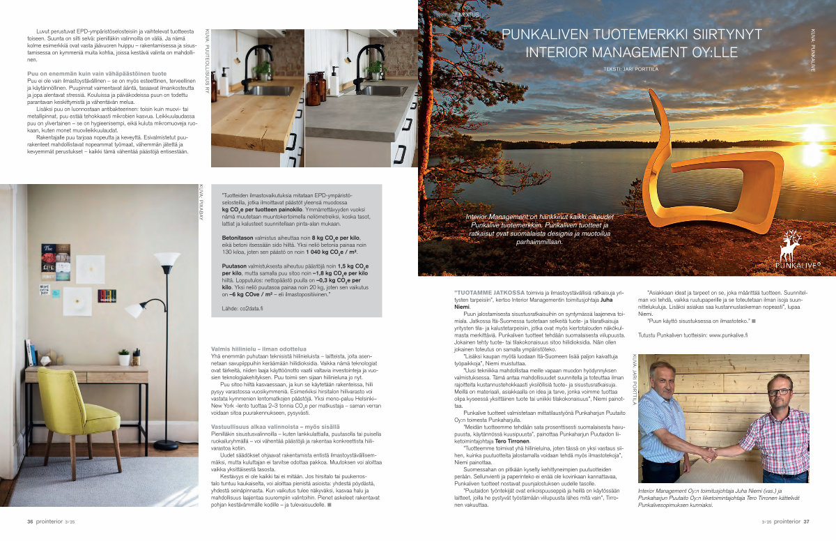 Puun jalostamisesta sisustusratkaisuihin on syntymässä laajeneva toimiala. Jatkossa Itä-Suomessa tuotetaan selkeitä tuote- ja tilaratkaisuja yritysten tila- ja kalustetarpeisiin, jotka ovat myös kiertotalouden näkökulmasta merkittäviä. Punkaliven tuotteet tehdään suomalaisesta viilupuusta. Jokainen tehty tuote- tai tilakokonaisuus sitoo hiilidioksidia. Näin ollen jokainen toteutus on samalla ympäristöteko.