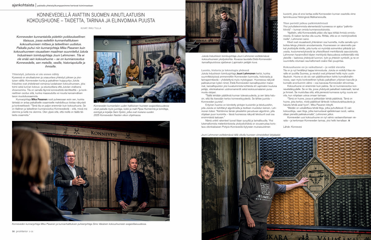 Kokoushuone on jo vaikuttanut – ja vetää vieraita Tila on jo nyt herättänyt laajaa kiinnostusta. Jukola on esitellyt tilaa vieraille eri puolilta Suomea, ja vierailut ovat johtaneet heillä myös uusiin tilauksiin. Huone ei ole siis vain päätöksenteon kehto kunnallishallinnossa, vaan myös konkreettinen työkalu paikallisen yrityksen kasvulle ja kunnalle arvonluonnin väline – osa kasvavaa Konneveden elinvoimaa.