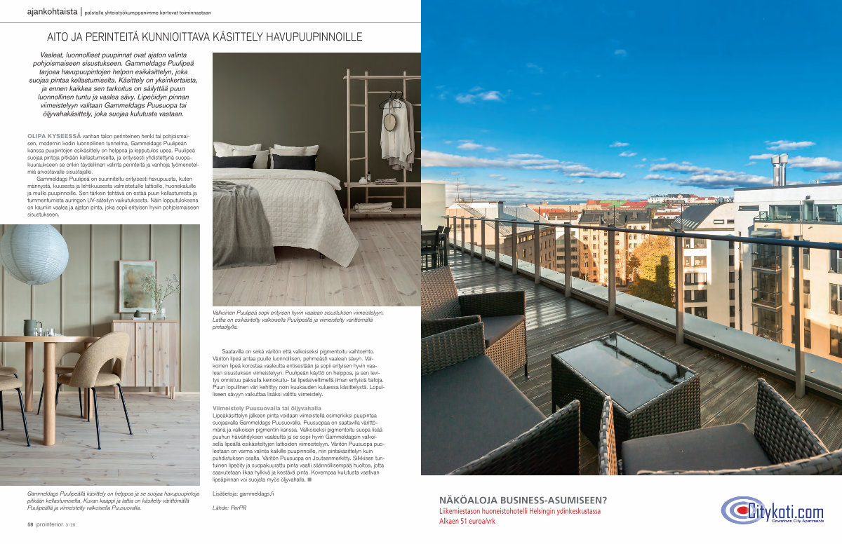Gammeldags Puulipeä on suunniteltu erityisesti havupuusta, kuten männystä, kuusesta ja lehtikuusesta valmistetuille lattioille, huonekaluille ja muille puupinnoille. Sen tärkein tehtävä on estää puun kellastumista ja tummentumista auringon UV-säteilyn vaikutuksesta. Näin lopputuloksena on kauniin vaalea ja ajaton pinta, joka sopii erityisen hyvin pohjoismaiseen sisustukseen.