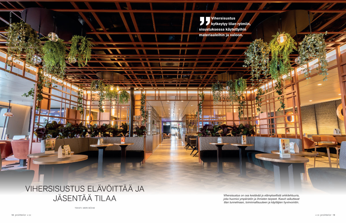 Vihersisustus kytkeytyy tilan rytmiin, sisustuksessa käytettyihin materiaaleihin ja valoon.