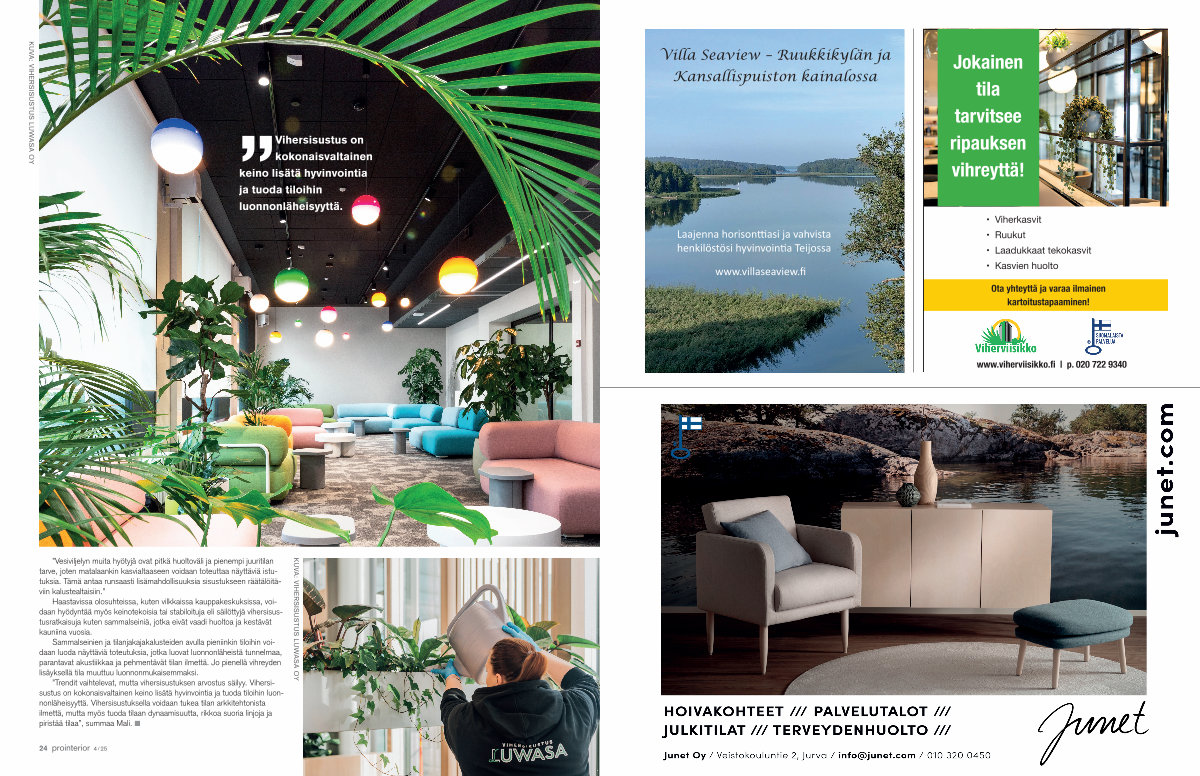 Vihersisustus on kokonaisvaltainen keino lisätä hyvinvointia ja tuoda tiloihin luonnonläheisyyttä.