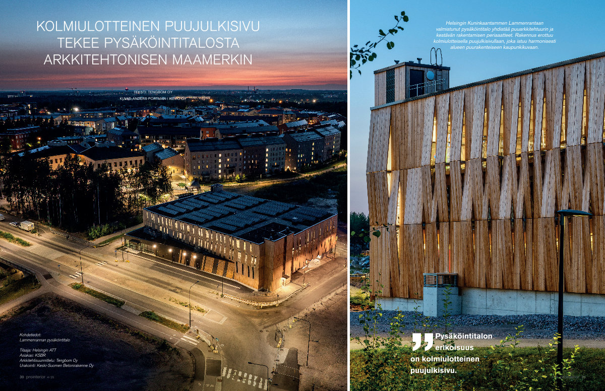 KOLMIULOTTEINEN PUUJULKISIVU TEKEE PYSÄKÖINTITALOSTA ARKKITEHTONISEN MAAMERKIN