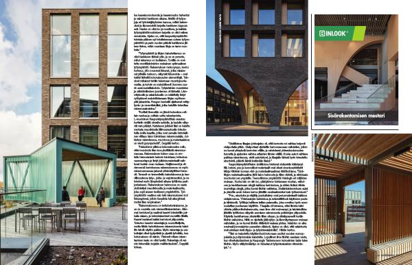 Kaupunkiympäristötalon sisätiloissa toistuvat sisäseiniin kääntynyt tiili , betoni , puu ja luonnolliset materiaalit ovat olleet sisustusarkkitehti Minja Hildénin luoman väri- ja materiaalimaailman lähtökohtana . ” Sisätilojen materiaalimaailma lähti talon hahmosta ja tiilen väristä , ja väriskaala muotoutui sen ympärille . Teemoitimme ympäristöä Helsingin eri miljöiden mukaan . Koska talo on niin iso , päädyimme toistamaan mustan , valkoisen ja keskiharmaan sävyjä kaikissa kerroksissa , ja niiden lisäksi vähän murrettuja sävyjä , jotka tuovat tiloihin vaihtelua . Sisääntulokerroksen aulat ja yleisölle avoin toinen kerros jätettiin neutraalimmiksi kuin työkerrokset .”