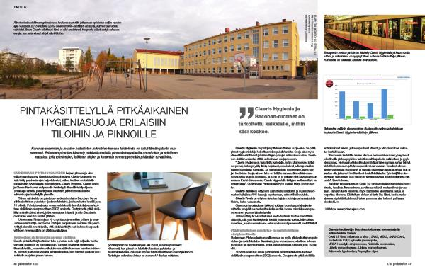 ” Claeris Hygienia on tarkoitettu kaikkialle , mihin käsi koskee . Erilaiset pinnat , kuten pöydät , tiskit , nojatasot , ovenkahvat ja liukuportaiden kaiteet käsitellään tuotteella . Se toimii kaikkein nopeimmin Claeris-sarjan tuotteista . Suoja-aineen teho on tutkittu kansainvälisissä laboratorioissa sekä useissa kohteissa , ja tuote on jo pitkään ollut käytössä muun muassa Keski-Euroopassa . Claeris Hygienialla tehtyjen testien määrä on erittäin laaja ”, Uudenmaan Pintasuojaus Ky : n osakas Merja Enroth kertoo .