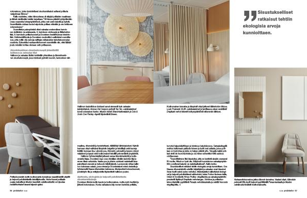 Ajattomia , ekologisia ja helposti puhdistettavia sisustusratkaisuja Docrateen tiloista luotiin kaunis ja kodinomainen , mutta myös kestävä ja järkevä kokonaisuus . Koska sairaalassa käy monen kuntoisia potilaita ,