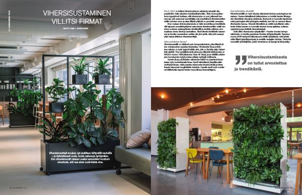 Viherelementtejä tuodaan nyt sisätilaan kiihtyvällä vauhdilla – ja ilahduttavasti uusia , luovia ratkaisuja hyödyntäen . Kun viherelementit otetaan osaksi esimerkiksi konttorin sisustusta , arki saa aivan uudenlaista eloa .
